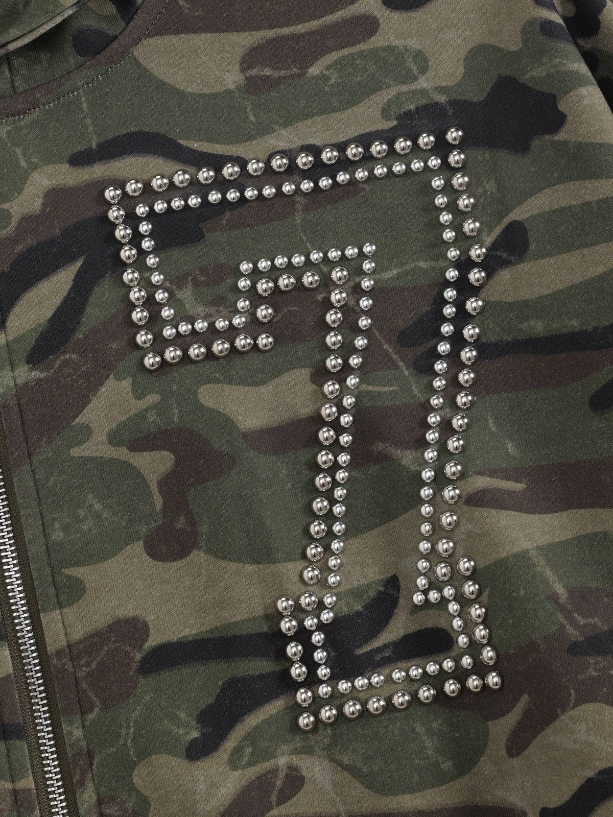 Featuring an all-over camouflage, this piece brings edge and attitude to your everyday rotation. The standout back design showcases a striking "77" made from metal studs, giving it a rugged, statement finish. A detailed embroidered brand logo sits on the chest for a touch of authenticity.