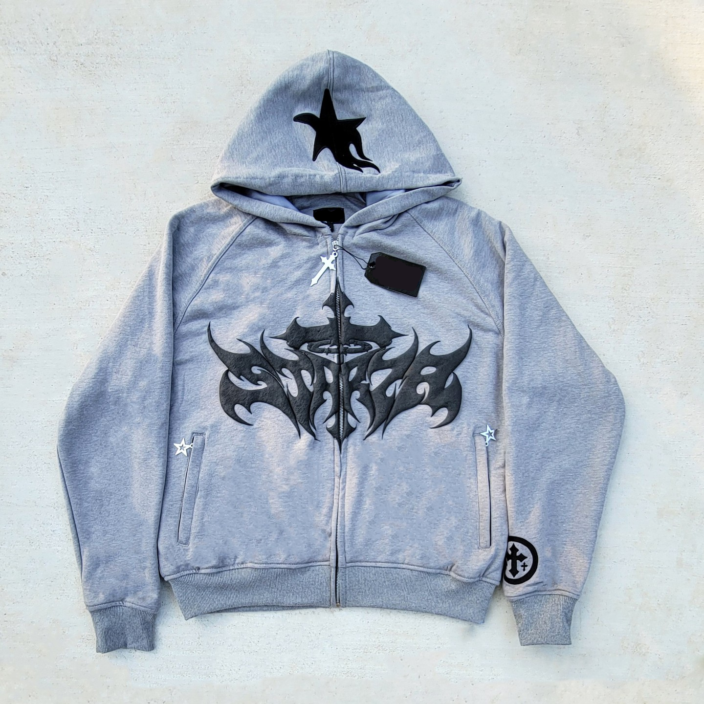 Cross appliqué printed zip-up hoodie$9.74 USD$68.99 USDDescribe your product