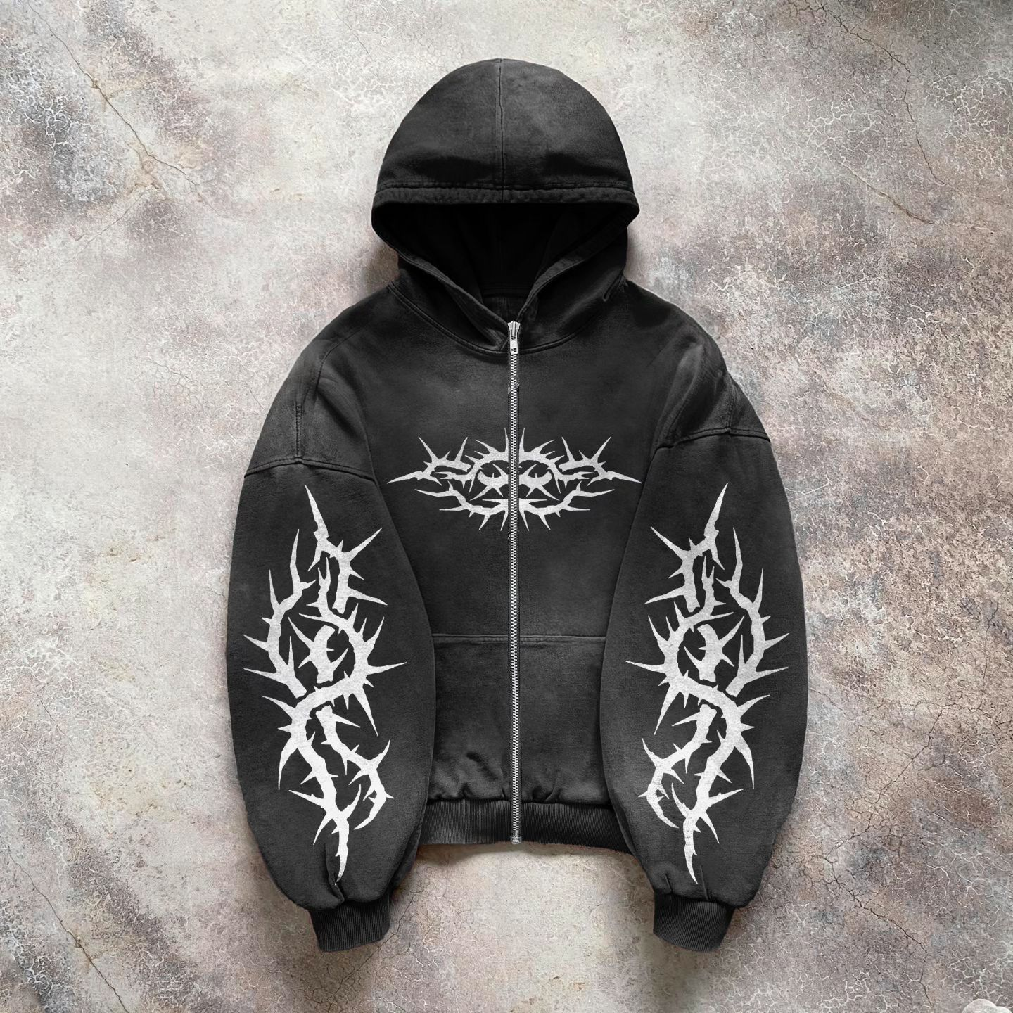 Gothic print contrast zip-up hoodie$10.72 USD$69.88 USDDescribe your product